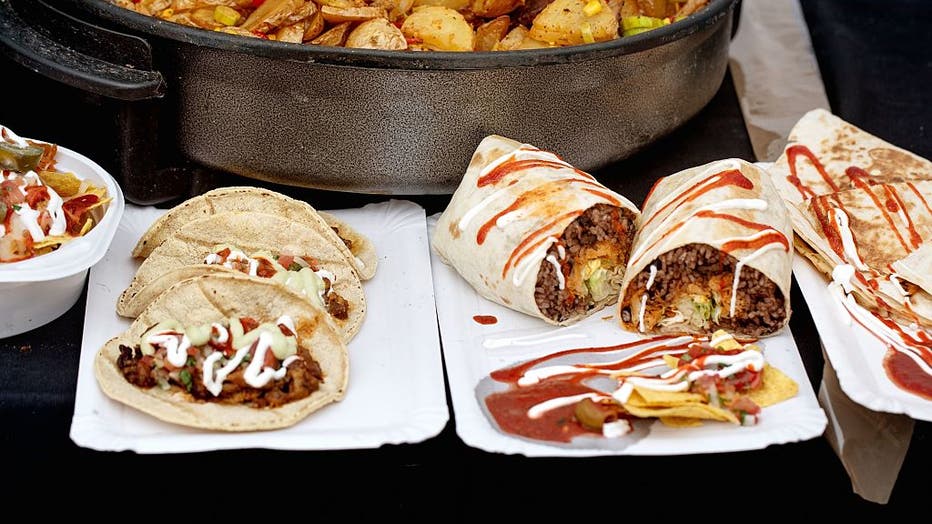 Delicious Mexican Street Food Display with Beef Tacos Burritos Nachos And Frying Pan with Potato Mix. Authentic Cuisine Served on Disposable Plates with Sauce. (Photo by: Natasha Breen/REDA/Universal Images Group via Getty Images)